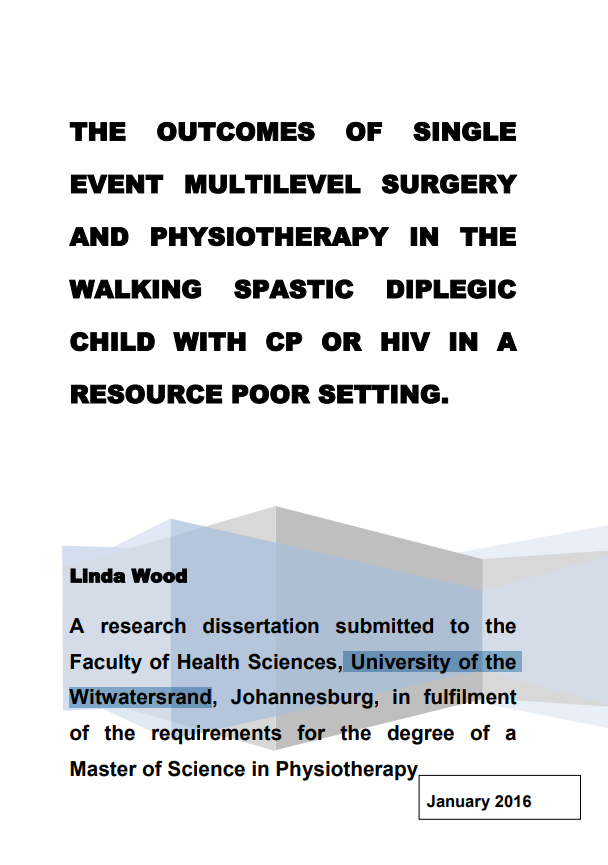 THE OUTCOMES OF SINGLE EVENT MULTILEVEL SURGERY AND PHYSIOTHERAPY IN THE WALKING SPASTIC DIPLEGIC CHILD WITH CP OR HIV IN A RESOURCE POOR SETTING.